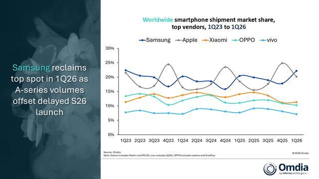 市场竞争格局方面,三星得益于其旗舰机型需求韧性,Galaxy S26 系列全球预售量相比 Galaxy S25 系列增长超 10%,因此在第一季度重夺市场榜首,市场占有率 22%。