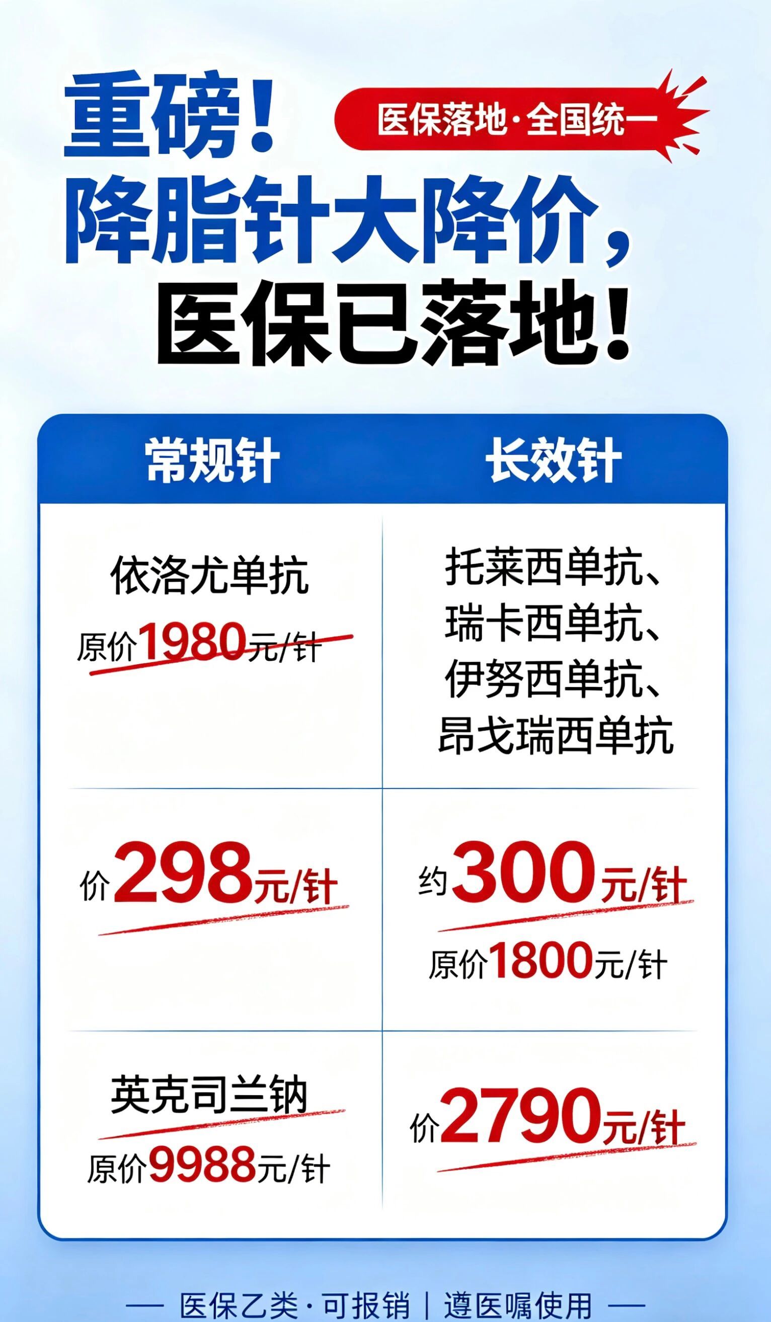 超长效的英克司兰钠(乐可为):原价9988元/针 → 医保价2790元/针;半年1针,一年2针