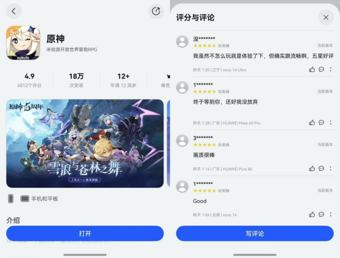 也正因为如此,《原神》鸿蒙版的如约而至,带来了不少惊喜——鸿蒙版《原神》上架首日,下载量就突破了10万次,这验证了鸿蒙生态的价值与潜力。同时,截至目前,已有近5000名用户在华为应用市场给出了评价,而高达4.9的评分,则证明了HarmonyOS足以经受高质量开放世界游戏的运行考验。可以见得,HarmonyOS的用户群体中有着大量的真实游戏玩家,并期待HarmonyOS上有着更多全新的游戏登陆。