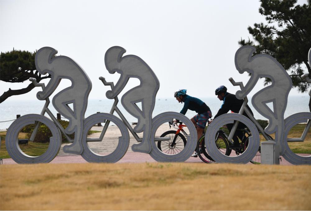 4月19日,自行车运动爱好者在万平口海边骑行绿道骑行。新华社记者 范长国 摄